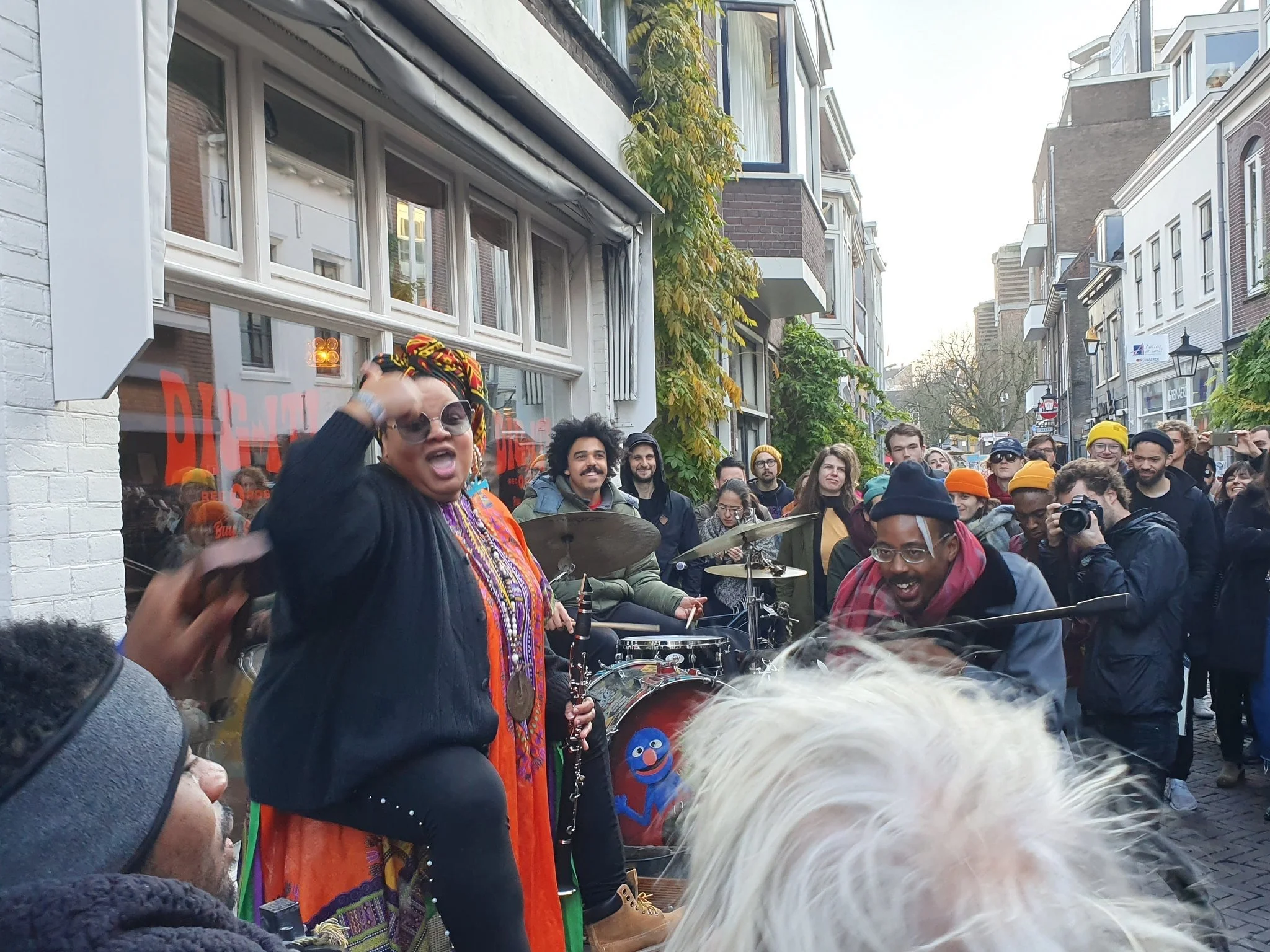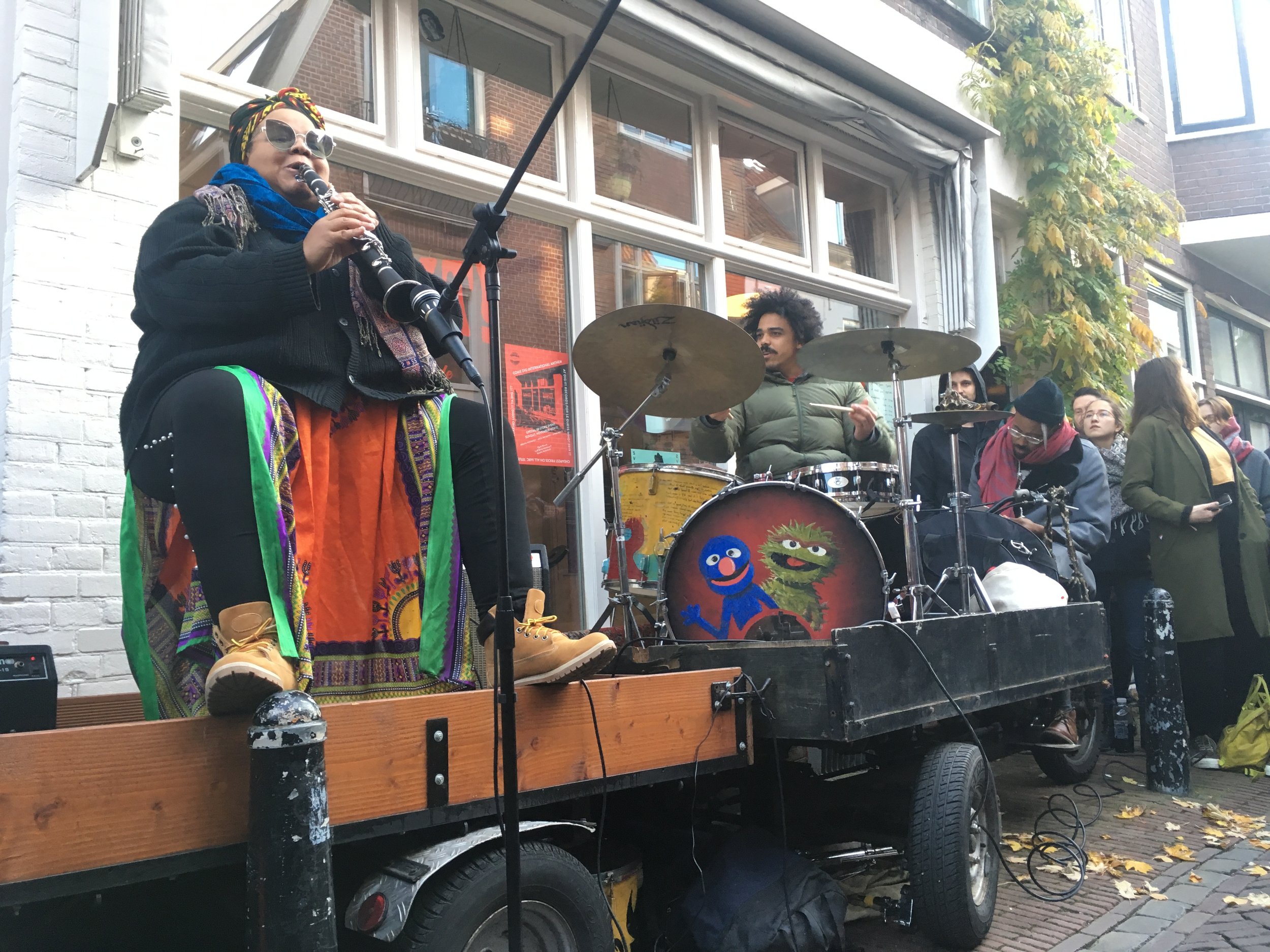 Angel and Asher going in, with Deacon Otis Cooke (bottom left) and Viktor Le Givens (right), on a stage made of opposing bakfiets outside of Dig It Records in Utrecht, NL, November 2019. Photo by Zach Long.