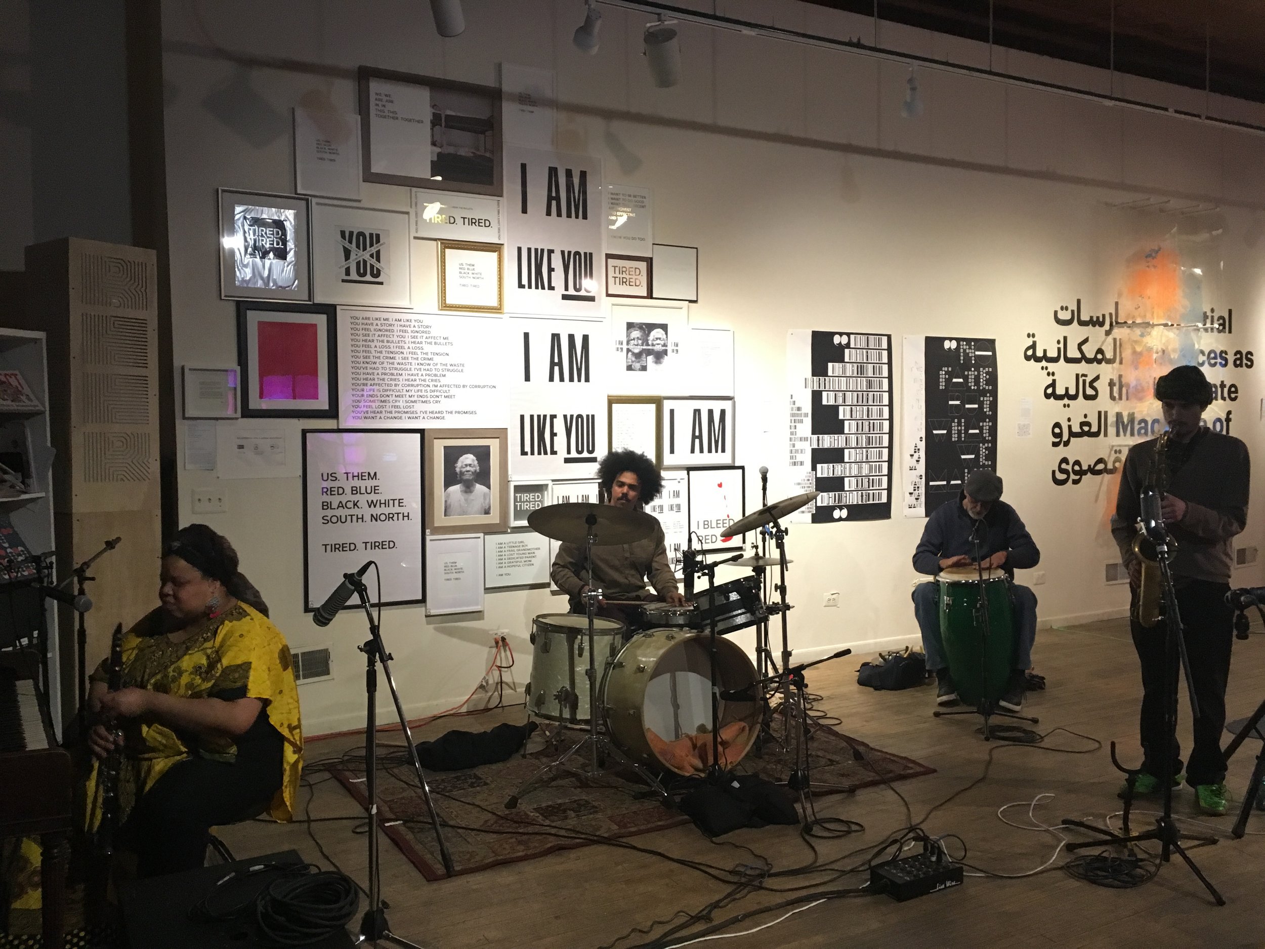 Angel Bat Dawid (left), Asher Gamedze (center left), Sura Dupart (center right), and Xristian Espinoza (far right), making sound at Co-Prosperity, Chicago, 2019. Photo by Scott McNiece.