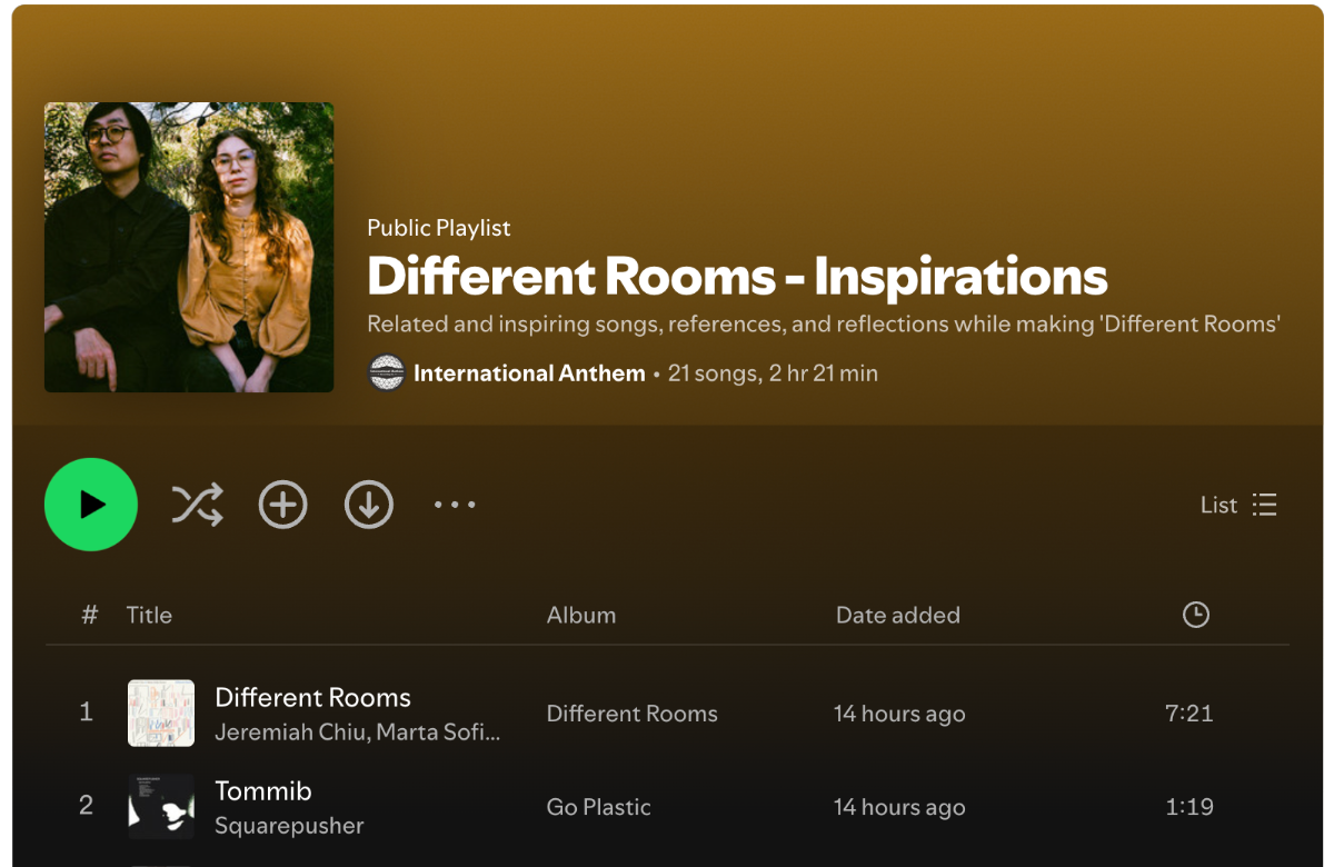 In this Spotify playlist curated by Chiu & Honer, they share twenty-one tracks that inspired, informed, or echoed the making of Different Rooms.