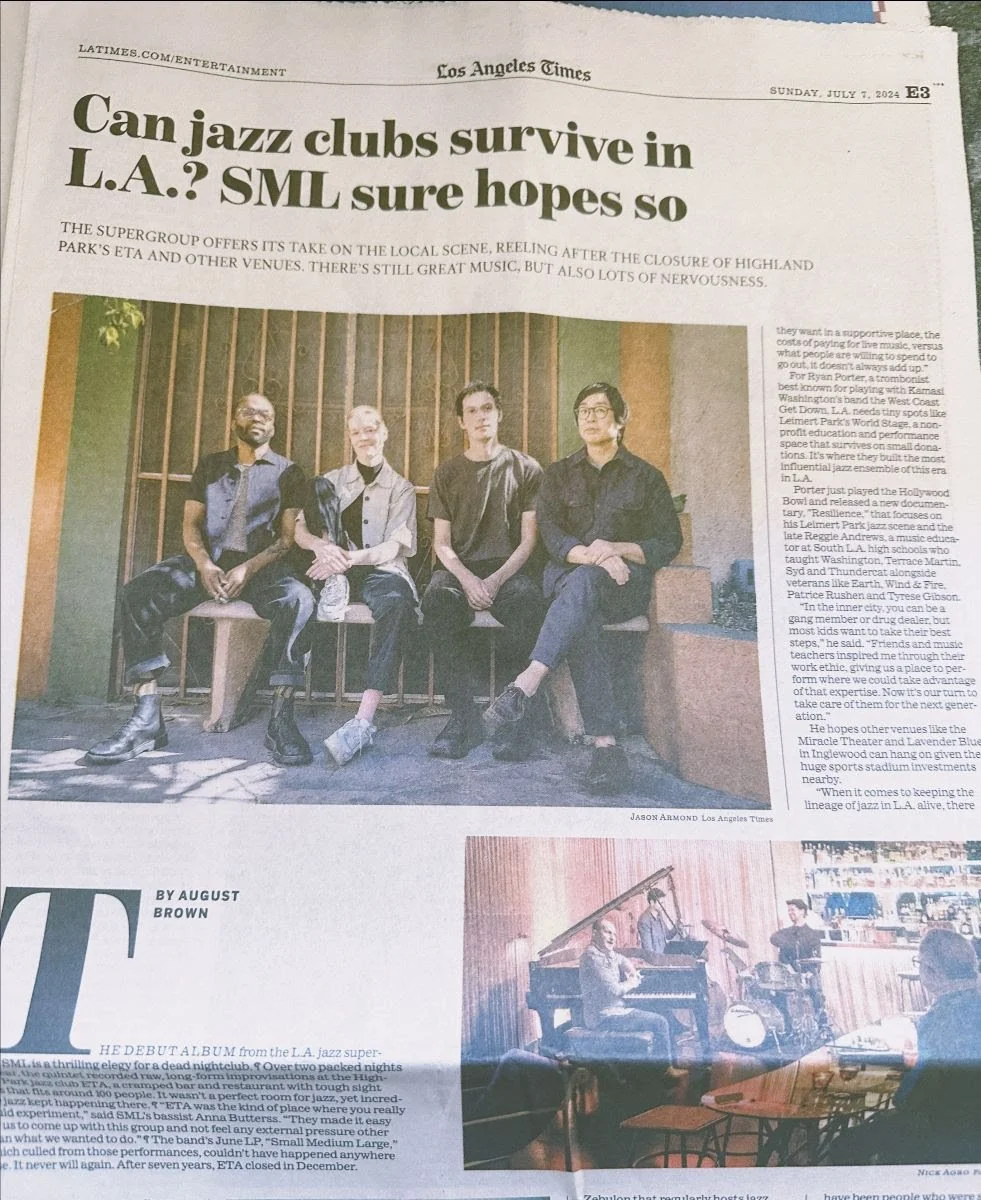 Though ETA would close its doors unexpectedly in 2023, the spirit of Parker’s Mondays lives on. The next group, and certainly not the last, to emerge from those sessions is SML (Small Medium Large), a quintet composed of luminaries from Los Angeles’s independent music scene featuring Butterss and Johnson alongside synthesist Jeremiah Chiu (Ariel Kalma, Marta Sofia Honer, Icy Demons), percussionist Booker Stardrum (Amirtha Kidambi, Lisel, Lee Ranaldo, Patrick Shiroishi) and guitarist Gregory Uhlmann (Sam Wilkes, Meg Duffy, Perfume Genius). Their self-titled debut album was released last Friday, June 28th on International Anthem and includes a note in the front insert commemorating ETA as “a bygone bastion of the new West Coast sound.”